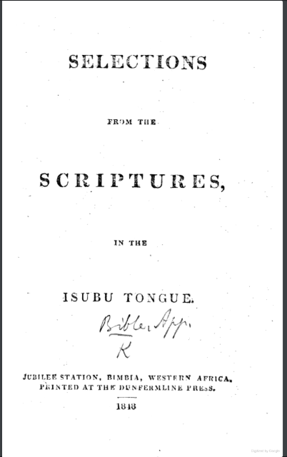 The Rev. Joseph Merrick translated portions of the Bible in Isubu between 1843 and 1852 with help from Mr.Alfred Saker who produced a grammar (1852) and a dictionary (1854); they were both of the Baptist Missionary Society.